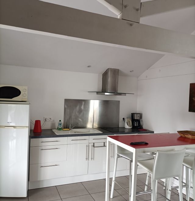 1 bedroom, living area with open-plan kitchen, baby equipment, barbecue.