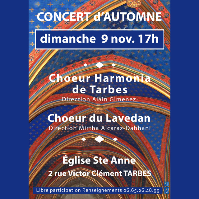 Le Choeur Harmonia de Tarbes, sous la direction d'Alain Gimenez, et le Choeur du Lavedan, sous la direction de Mirtha Alacaraz-Dahhani, sont heureux de vous présenter leur Concert d'Automne.