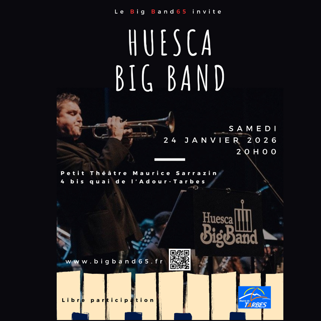 Le Big Band 65 reçoit pour la seconde fois le Huesca Big Band dans le cadre du jumelage entre les deux villes, avec le soutien des Mairies de Tarbes et d'Huesca.