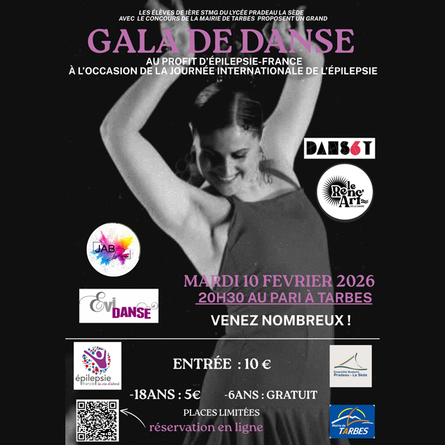 Venez assister au grand Gala de danse organisé par les élèves de la classe de 1ère STMG du Lycée de Pradeau-La-Sède (65), avec le concours de la Mairie de Tarbes, au profit de l'association Épilepsie-France, à l'occasion de la Journée Internationale de l'Épilepsie !