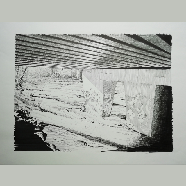 De ses promenades, sur le Caminadour, à pied ou à vélo, Pierre Tarboulier revient avec des croquis rapides ou des séries de photos aide-mémoire. Plus tard, il en tire des dessins en noir et blanc ou des toiles à l'acrylique.