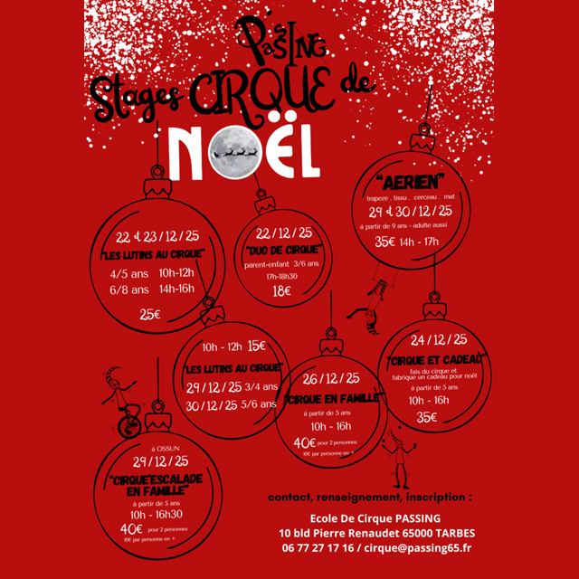 Voici le programme des stages proposés par l'école de cirque Passing pour les vacances de Noël 2024 : de quoi faire le plein de sourires et de bonne humeur pour vos enfants !