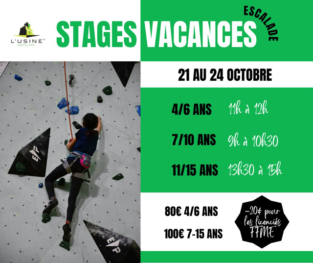 Pendant les vacances scolaires, l'Usine Escalade vous propose une formule de 4 jours de stages pour enfants de 4 à 15 ans.