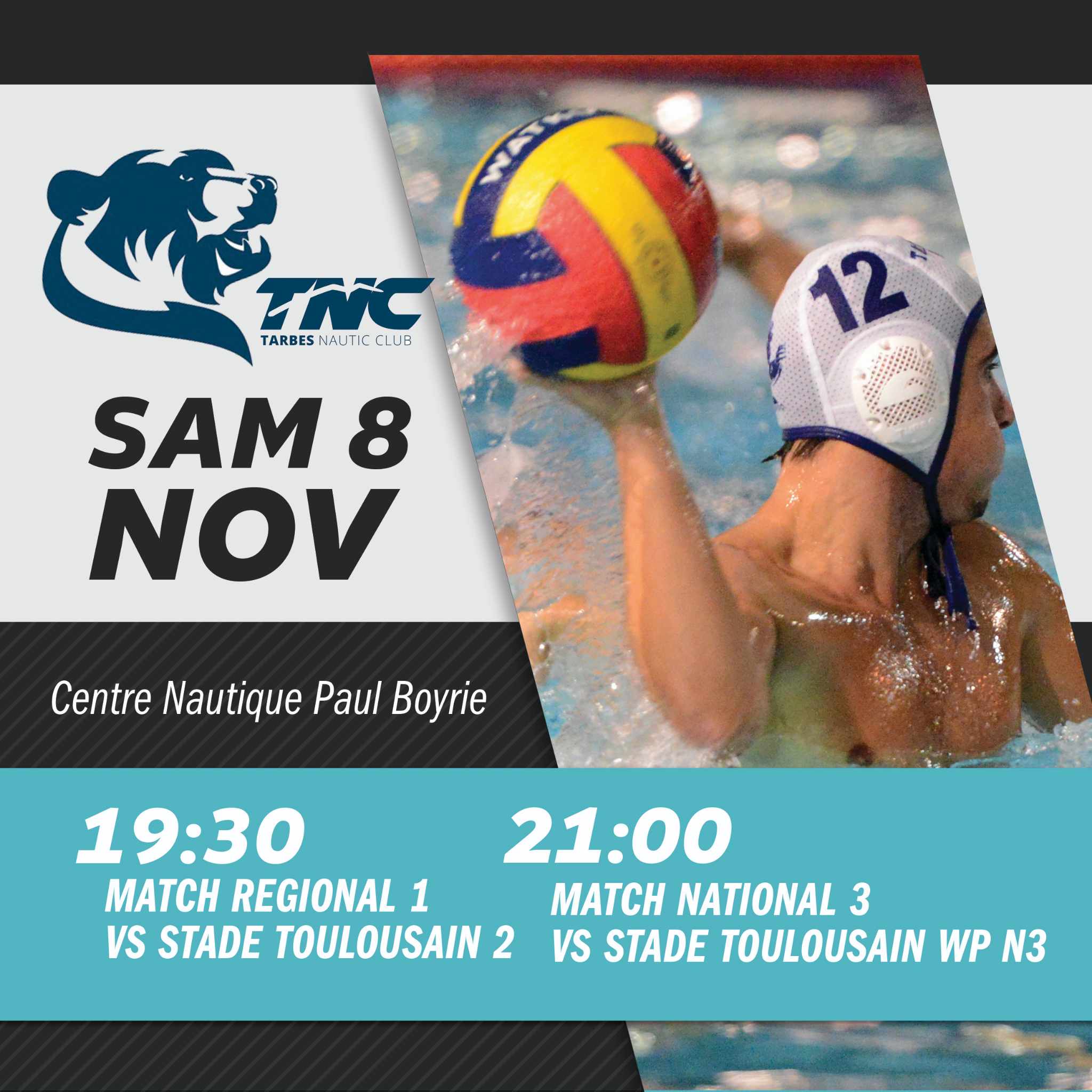 - 21h : Tarbes Nautic Club (TNC) N3 / Stade Toulousain Water-Polo (STWP) N3